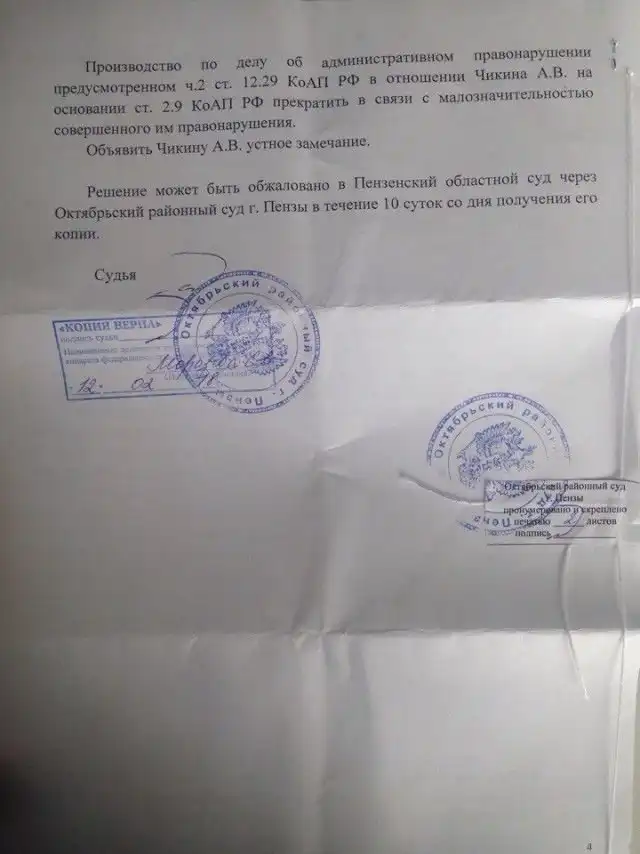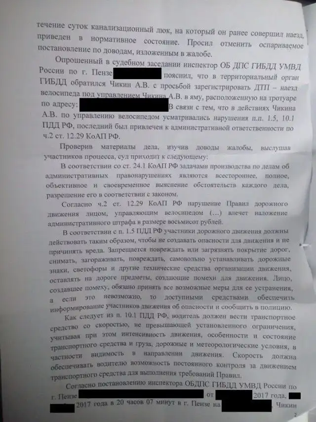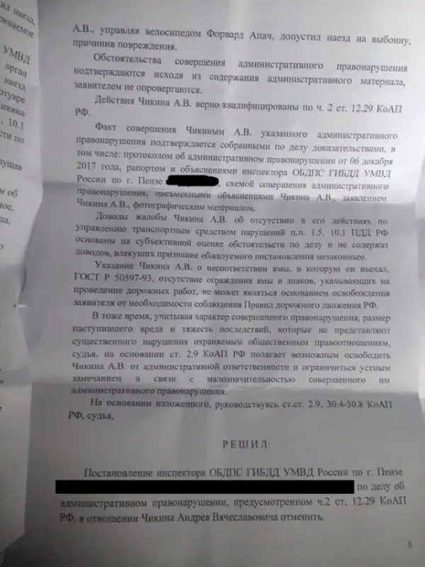 В суд г. Пензы обратился гражданин Чикин А. В. с жалобой на дорожные службы: передвигаясь на велосипеде, он наехал на яму, что закончилось для Чикина весьма неблагоприятно. Суд, рассмотрев жалобу, вынес постановление о наказании велосипедиста штрафом за «наезд на выбоину, причинив повреждения». Чикин посмел жаловаться на то, что яма не была огорожена, «не соответствовала ГОСТу» и отсутствовали какие-либо знаки о проведении дорожных работ. За что и поплатился вынесением приговора, который он не применил обжаловать.