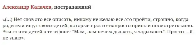 Очевидцы трагедии в торговом центре "Зимняя вишня" в Кемерово рассказали о ситуации, которая происходила в здании в момент пожара. По их словам, повсюду царила паника, люди бежали к выходам, когда все уже было затянуто густым дымом, а в отдельных местах бушевало открытое пламя.