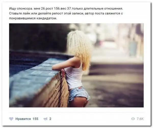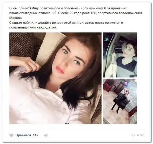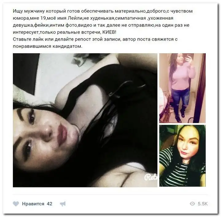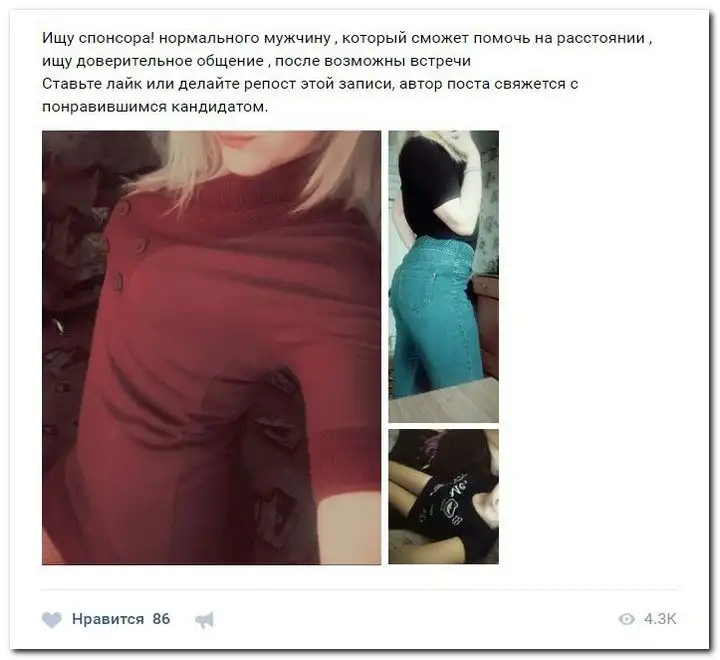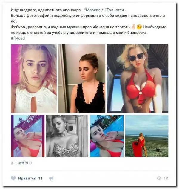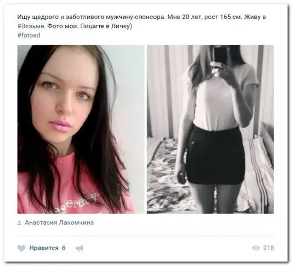 Эти наивные девушки хотят красиво жить и ничего не делать. Они надеются, что богатые спонсоры увидят их красоту, и в очередь выстроятся, предлагая свою помощь. Некоторые даже пишут, что никого интима, им должны заплатить чисто за приятное общение.