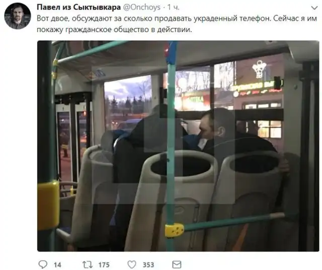 14 апреля житель Сыктывкара помог полиции задержать двух подозреваемых в краже мобильного телефона, которые ехали вместе с ним в общественном транспорте. Пассажир услышал разговор двух мужчин, обсуждавших то, за сколько можно продать украденный телефон. О подозреваемых в краже он сообщил в полицию, после чего стал вести трансляцию на своей странице в Twitter.