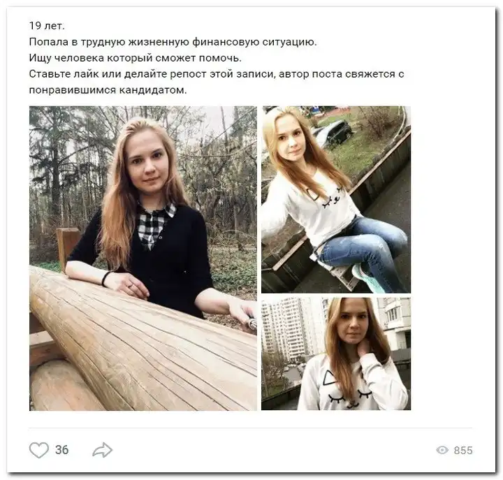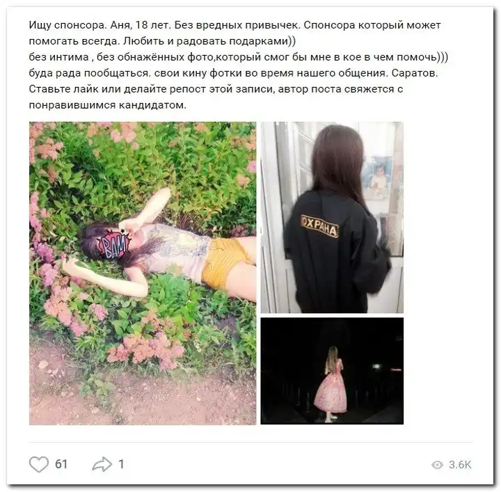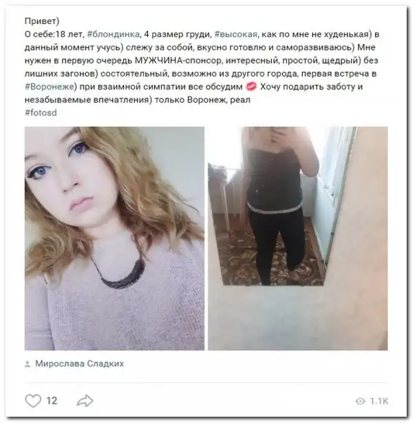 Эти наивные девушки хотят красиво жить и ничего не делать. Они надеются, что богатые спонсоры увидят их красоту, и в очередь выстроятся, предлагая свою помощь. Некоторые даже пишут, что никого интима, им должны заплатить чисто за приятное общение.
