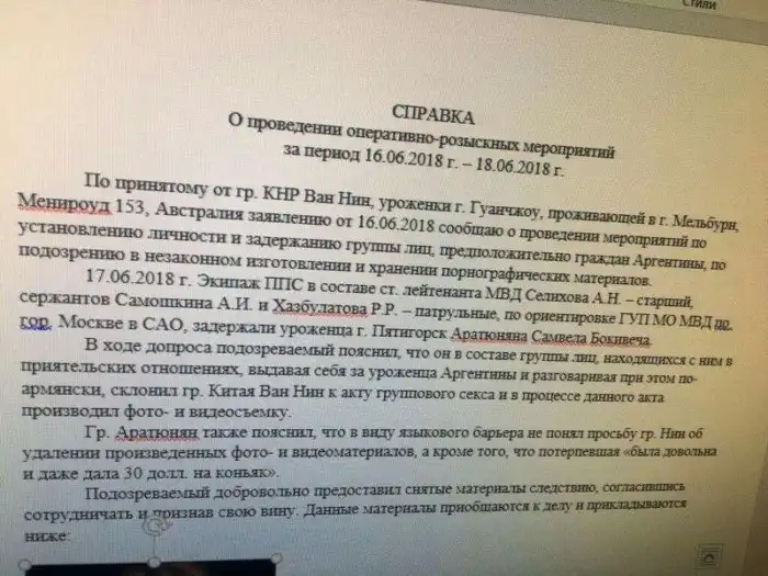 34-летняя китаянка приехала в Москву на ЧМ-2018, познакомилась с двумя веселыми аргентинцами и решила продолжить с ними общение в своем номере отеля "Авеню". Там они занялись сексом (по обоюдному согласию, что важно), однако девушка заметила, что ее снимают на камеру телефона, и это ей не понравилось. Она попросила мужчину удалить видео, но засомневалась в его честности и обратилась в полицию, попросив разыскать мужчин. Их нашли, но они оказались не совсем аргентинцами, сообщает Спорт-Экспресс.
