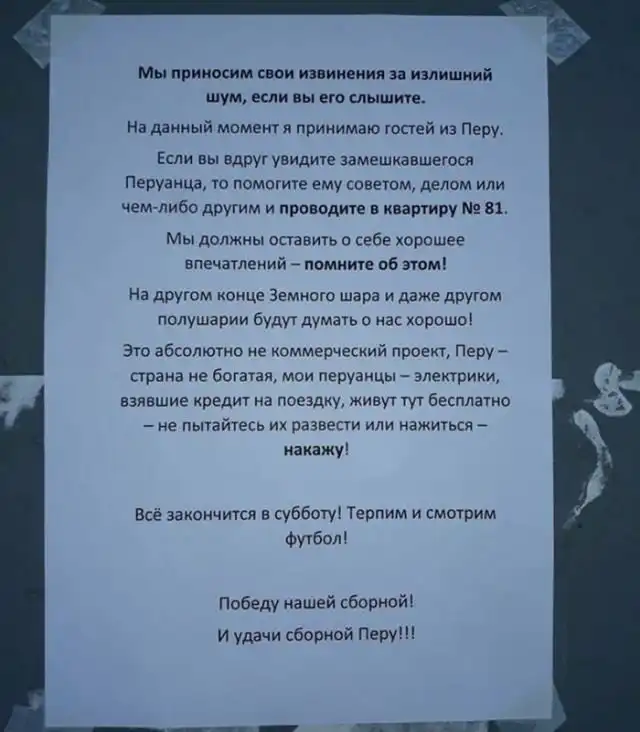 Жителей одного из домов по улице Уральской в Пионерском поселке Екатеринбурга очень удивило объявление, в котором их сосед попросил с пониманием отнестись к тому, что он принимает в своей квартире гостей из Перу. Он пригрозил жильцам дома не обижать иностранцев. Люди сфотографировали это объявление и опубликовали в социальной сети. Пост очень быстро стал вирусным и распространился по интернету.