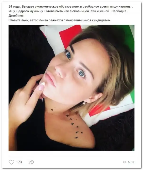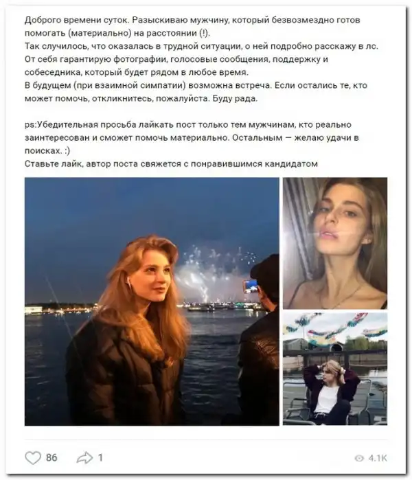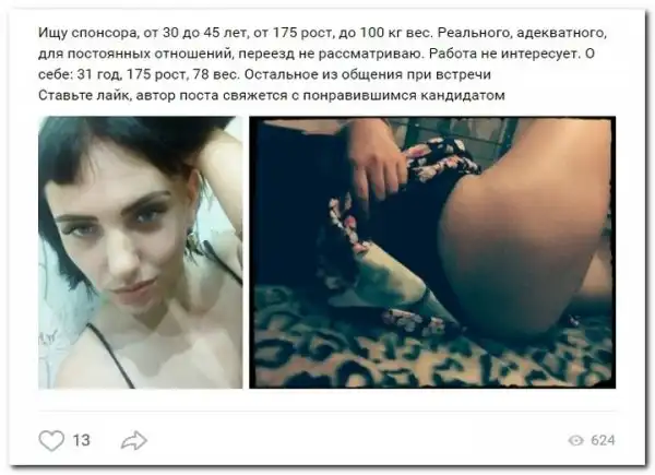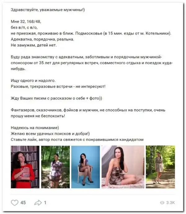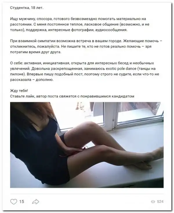Эти наивные девушки хотят красиво жить и ничего не делать. Они надеются, что богатые спонсоры увидят их красоту, и в очередь выстроятся, предлагая свою помощь. Некоторые даже пишут, что никого интима, им должны заплатить только за приятное общение.
