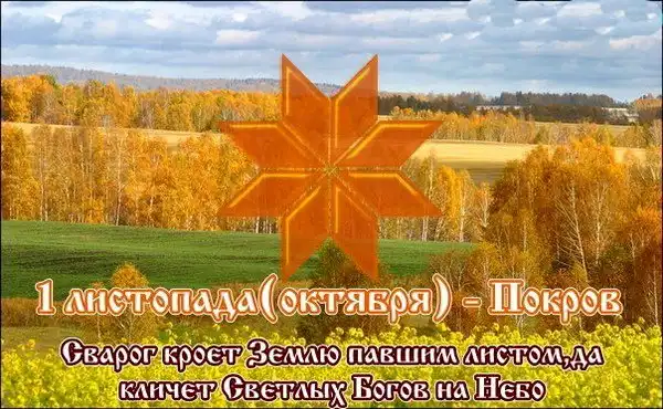 1 октября - Сварог кроет Землю павшим листом да кличет Светлых Богов на Небо (в Сваргу). На Земле - конец осенних хороводов, начало зимних посиделок. Пора, когда осень "переламывается" на зиму.