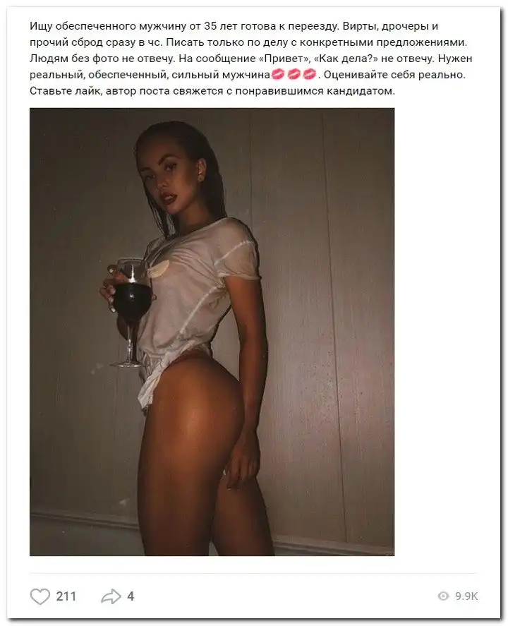 Эти наивные девушки хотят красиво жить и ничего не делать. Они надеются, что богатые спонсоры увидят их красоту, и в очередь выстроятся, предлагая свою помощь. Некоторые даже пишут, что никого интима, им должны заплатить только за приятное общение.