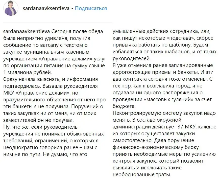 И вновь мэр Якутска оказалась в центре внимания после своей сегодняшней публикации. Как стало известно, Сардана Авксентьева решила отменить банкеты и гулянья за счет городского бюджета, из которого на услуги по организации питания планировалось выделить более 1 миллиона рублей. Когда она решила разобраться в этой ситуации, информация подтвердилась, хоть она не давала никаких распоряжений о проведении "массовых гуляний".