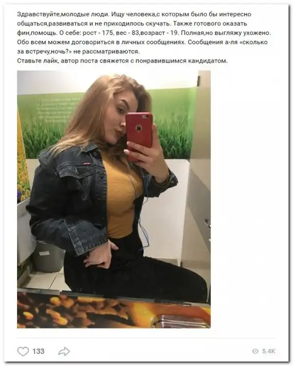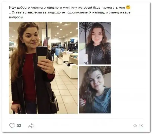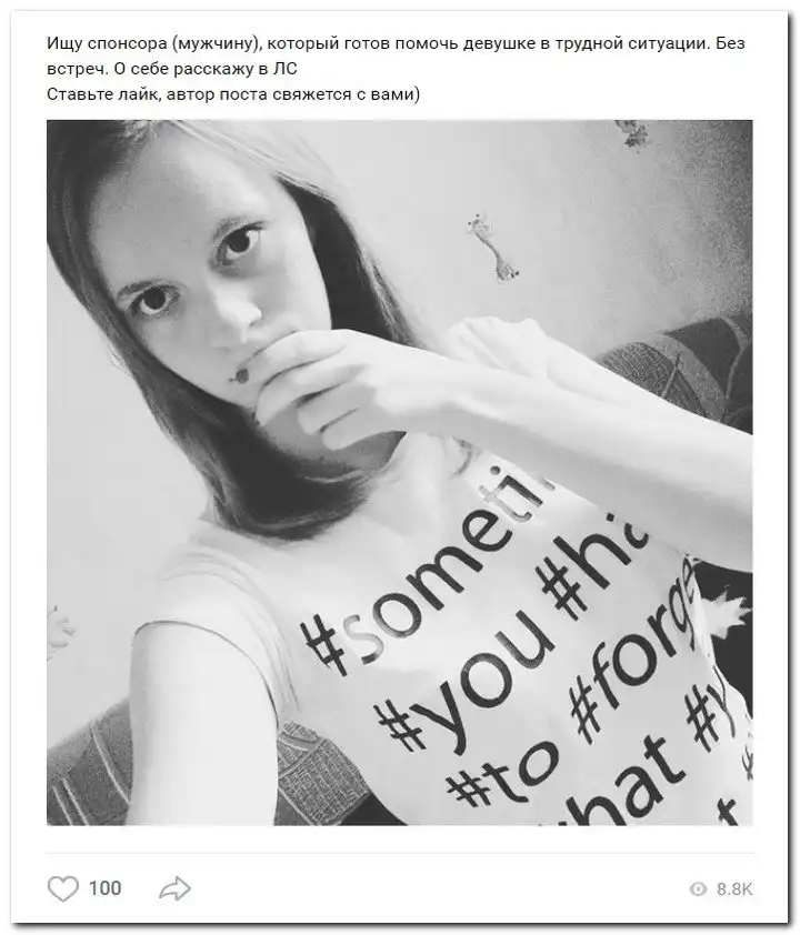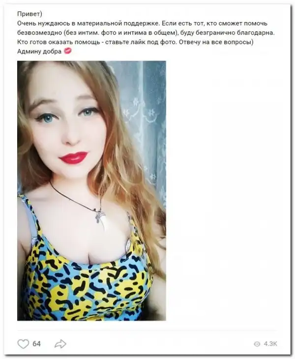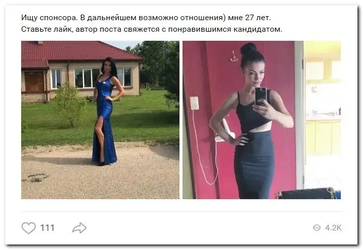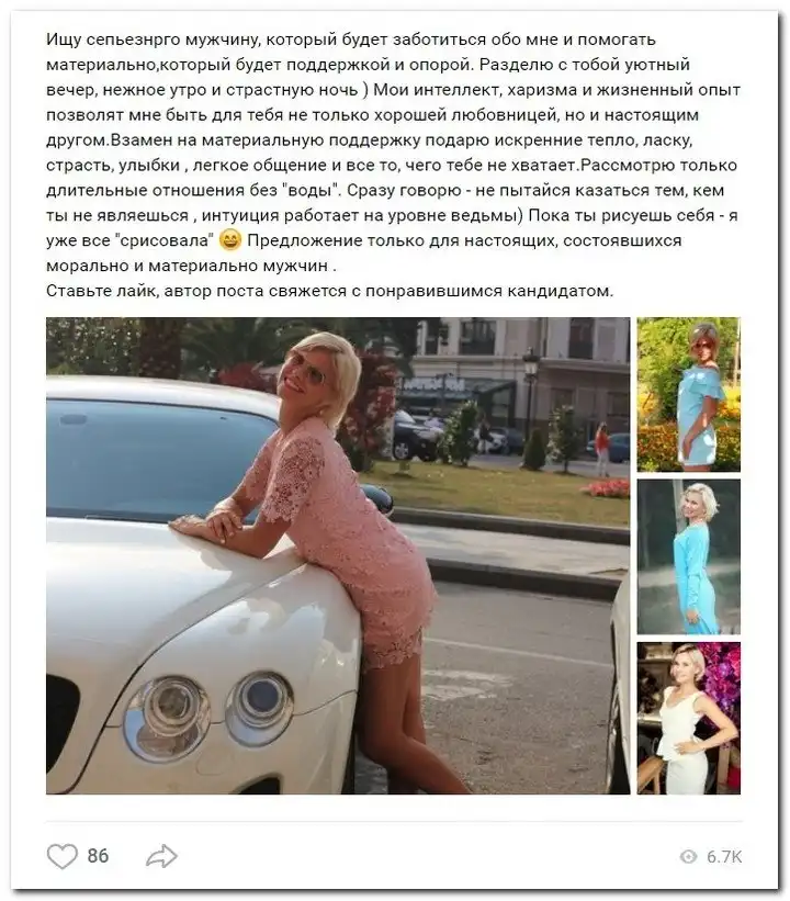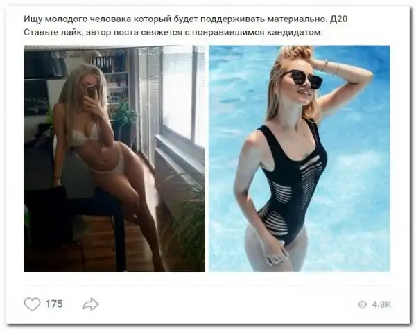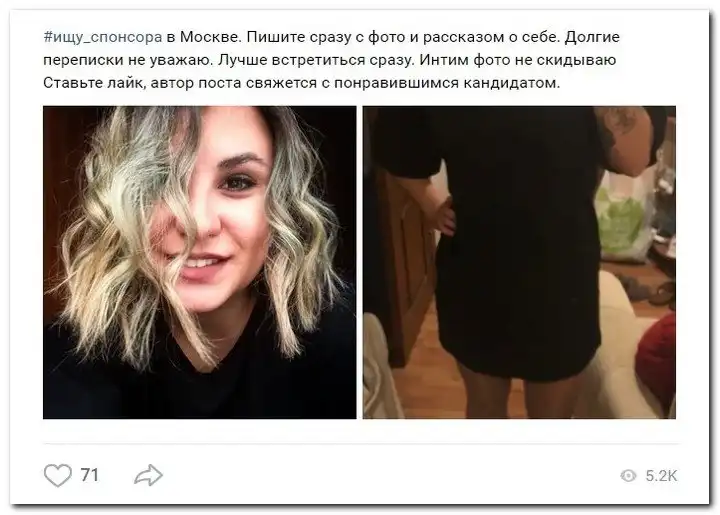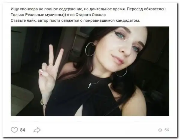 Эти наивные девушки хотят красиво жить и ничего не делать. Они надеются, что богатые спонсоры увидят их красоту, и в очередь выстроятся, предлагая свою помощь. Некоторые даже пишут, что никого интима, им должны заплатить только за приятное общение.