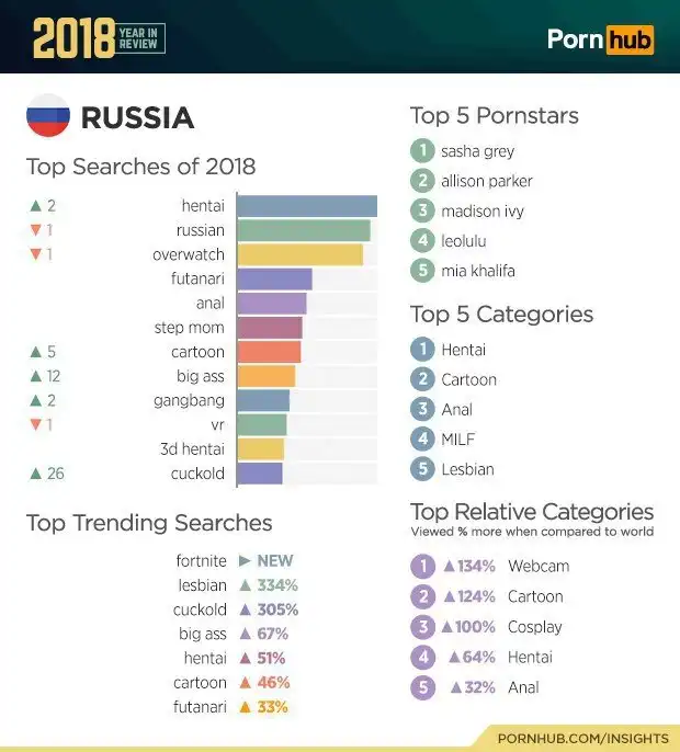 Изменились и предпочтения в контенте по сравнению с прошлым годом. К примеру, запрос "Anime" в 2018 году возрос на 367%, "Hentai" на 113%, а "Cartoon" на 79%.