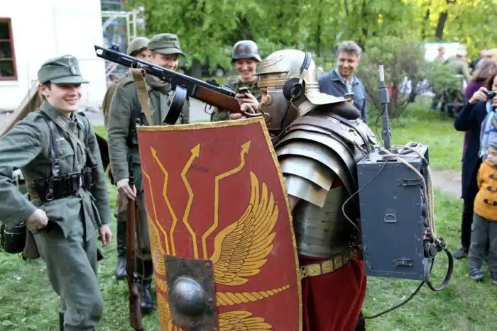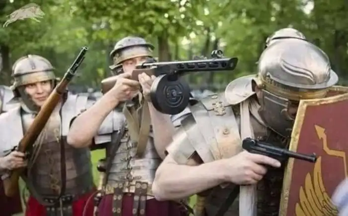 Как, например, можно объяснить тот факт, что римские легионеры на фотографии ниже (у пользователей телефонов картинка может убежать наверх) в качестве вооружения используют немецкий карабин Kar98K 1935 года выпуска, советский ППШ-41 и пистолет Люгера, созданный в начале 20 века?