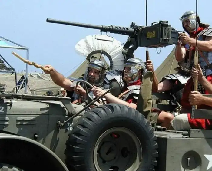 Но как такое возможно, ведь легионеры существовали еще до нашей эры? Где в это время они смогли раздобыть, например, Джип с пулеметом Браунинга?