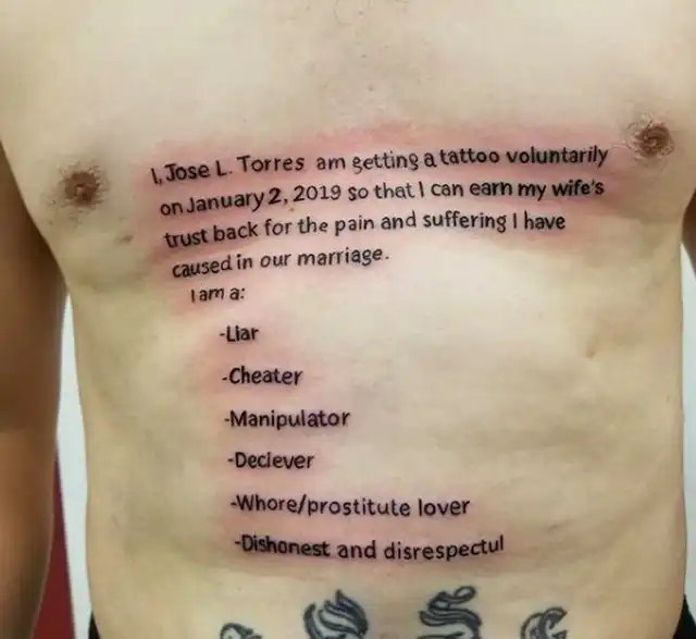 Житель Техаса решил извиниться перед своей женой за всю боль, которую он ей причинил. По его мнению, такая татуировка поможет ему получить прощение, но вот пользователи сети наоборот уверены, что теперь им грозит неминуемый развод. Татуировщик по имени Джордж, который работает в одном из салонов Техаса сделал все, о чем его попросил клиент, а если точнее, набил на его теле "слова раскаяния". Хотите взглянуть на то, что из этого вышло? Честно говоря, хотелось бы увидеть реакцию женщины на такое "признание".