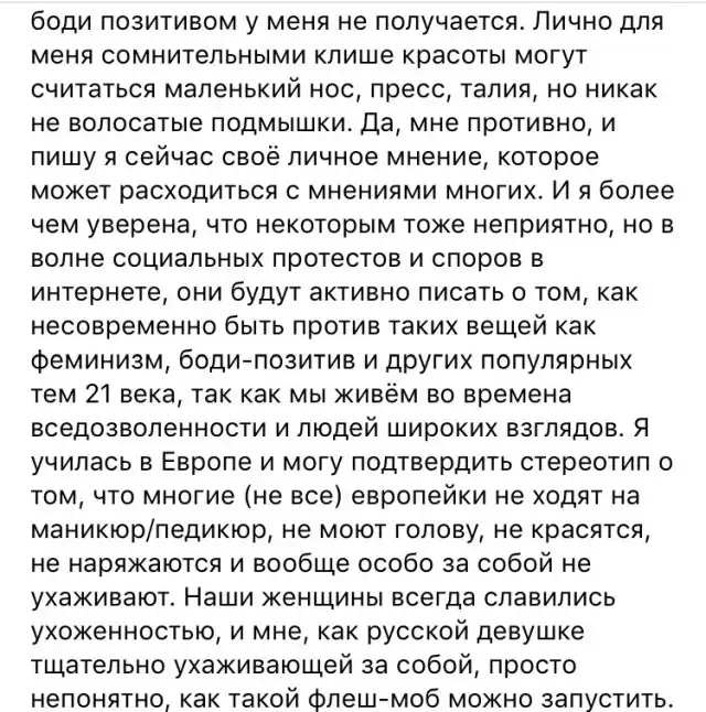 Дочь пресс-секретаря президента РФ Дмитрия Пескова 21-летняя Елизавета в своем Instagram-аккаунте высказалась о том, что не понимает женщин, которые проповедуют модное движение под названием бодипозитив. Девушка пояснила, что она не понимает, как вообще целлюлит, прыщи и небритые ноги могли стать вдруг модными, и зачем такие фотографии вообще публиковать в социальных сетях. По словам Песковой, российские девушки всегда славились на весь мир своей ухоженностью, поэтому им не следует уподобляться европейкам, многие из которых не ходят на маникюр, не моют голову, не красятся, не наряжаются и вообще не особо за собой следят.