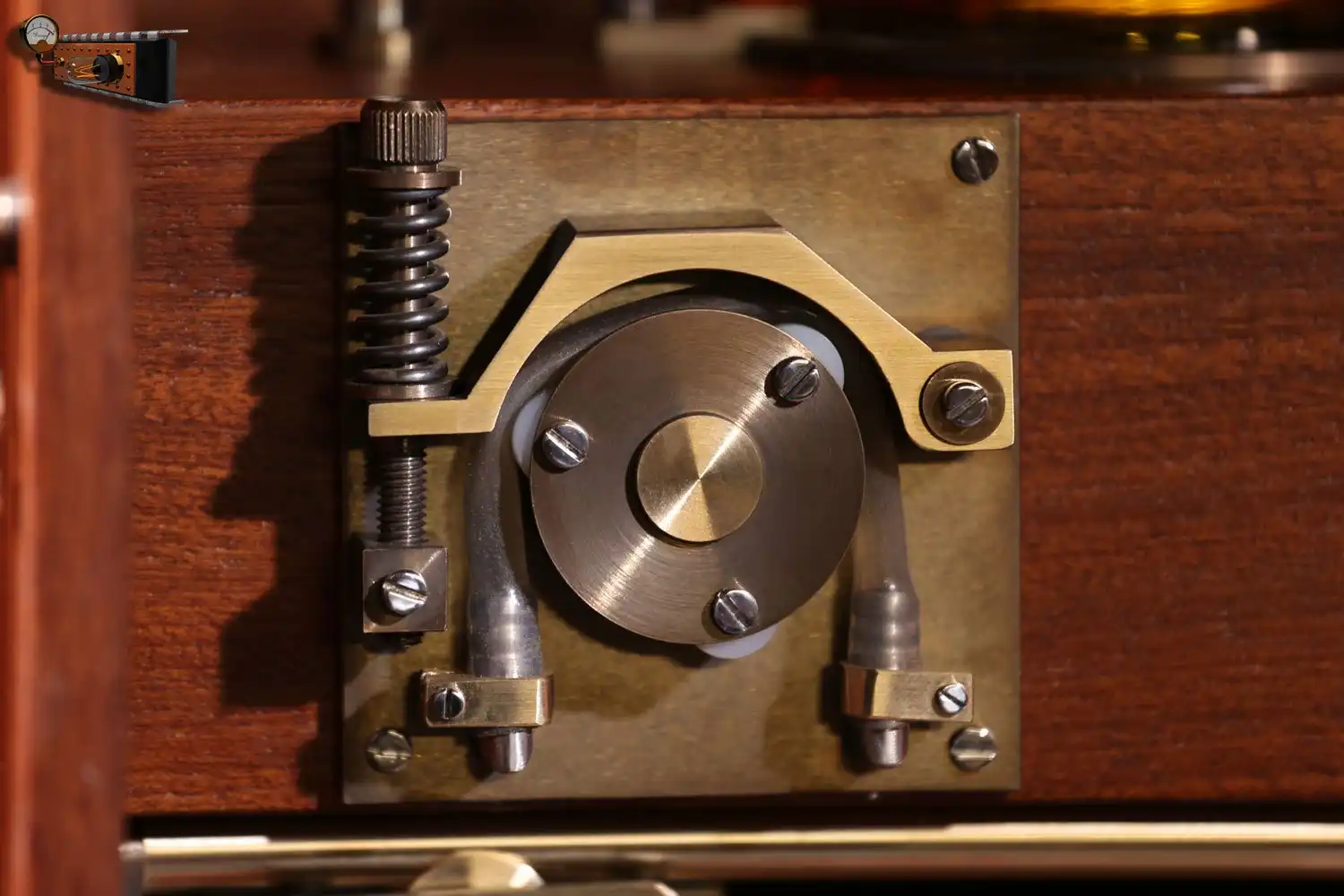 Каретка имеет один ведущий и два прижимных ролика, один из прижимных роликов расположен на подвижной подпружиненной кулисе, это позволяет каретке не терять сцепление с направляющими.