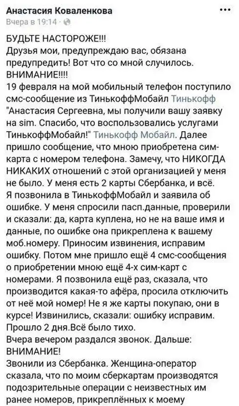 Девушка по имени Анастасия решила поделиться историей о том, как мошенники пытались украсть деньги с ее банковских карт. Она описала все происходящее в своем посте в социальной сети. Рекомендуем к прочтению, чтобы вы и сами не попались на удочку мошенников.