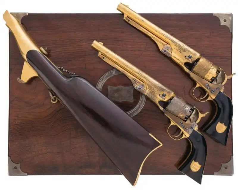 Позолота, золото, черное дерево, оригинальный кейс, приклад. Ориентировочная аукционная стоимость $350,000.
