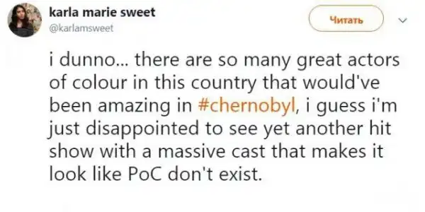 "Посмотрела два эпизода "Чернобыля", очень хорошо! Только есть одна мысль... я понимаю, что все персонажи в реальной жизни были белыми, но они также говорили с украинским акцентом. А здесь актеры с акцентами со всей Великобритании. Так если они не следуют достоверности в этом, почему не ввести в сериал темнокожих людей?" - пишет Карла.