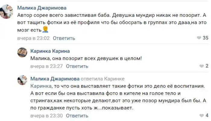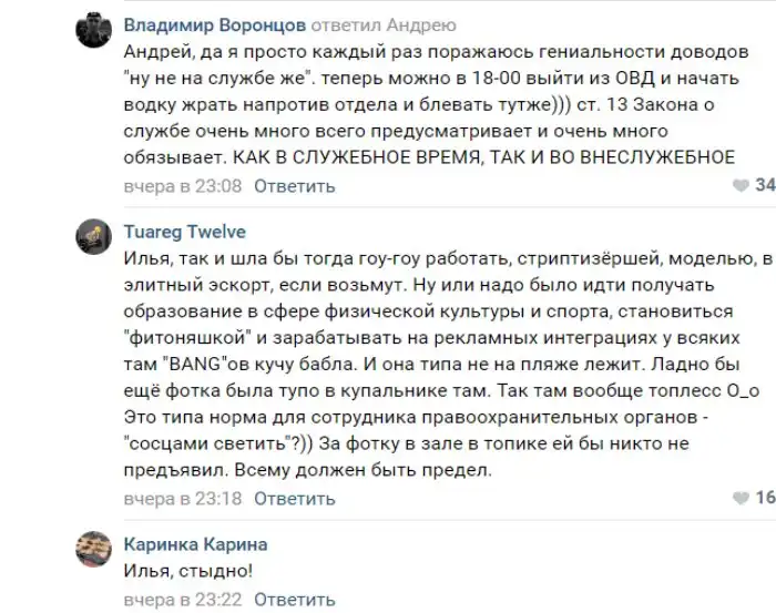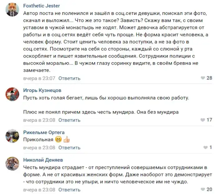 Обнародовавший фото взывал к чести и сетовал, что подобными фото девушка позорит мундир. Среди обсудивших эти снимки нашлось немало сторонников мнения, что выпускница МВД попала в эту структуру по ошибке.