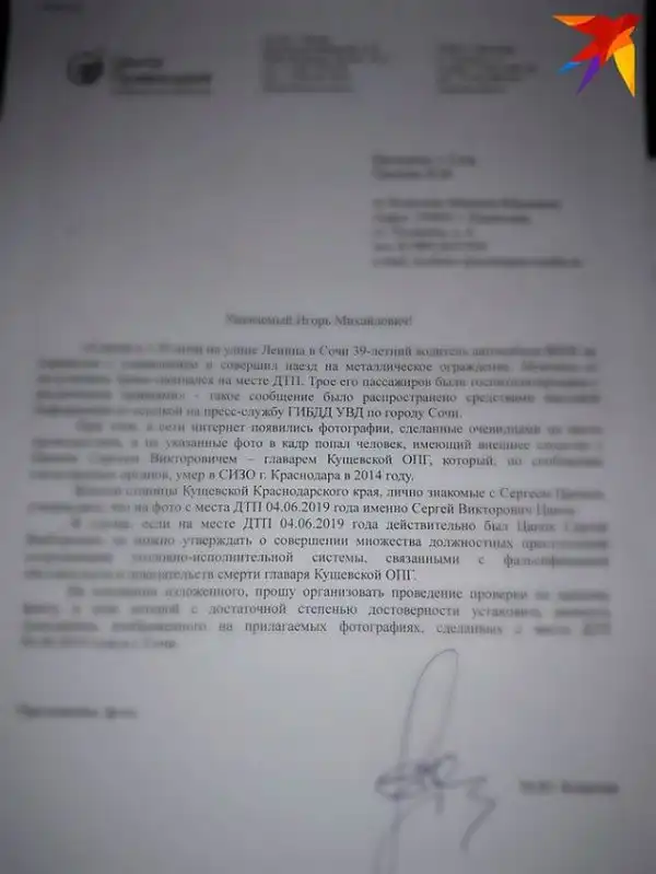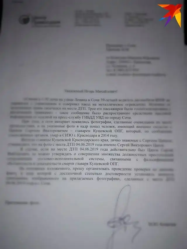 "Уважаемый Игорь Михайлович. В сеть интернет попала фотография, на которой зафиксирован человек, имеющий внешнее сходство с лидером кущевского ОПГ Сергеем Цапком. Жители станицы Кущевской хорошо знали умершего главаря банды и утверждают, что на фото именно Сергей Викторович Цапок. Если этот факт подтвердится, то можно будет утверждать о совершении целого ряда должностных преступлений. Просим провести проверку и установить достоверно личность человека, попавшего в кадр", - говорится в заявлении граждан.