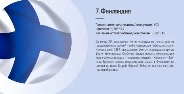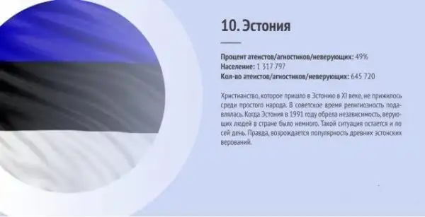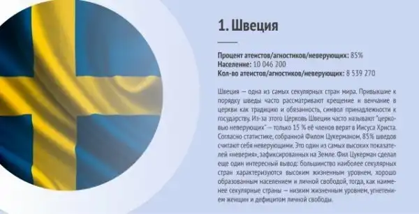 Социолог Фил Цукерман опубликовал интересные статистические данные, рассказывающие о ТОП-10 странах, в которых наибольшее количество неверующих и атеистов. Согласно его исследованию, большинство наиболее секулярных стран можно охарактеризовать высоким уровнем жизни и хорошо образованным населением.