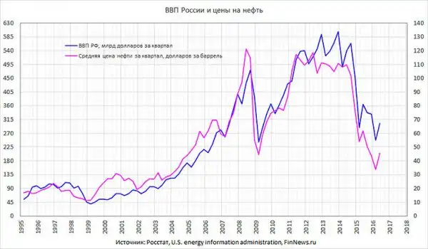 Для начала взгляните на график корреляции роста ВВП и средней цены барреля Нефти марки "Brent". На графике четко видно, что чем дороже нефть, тем больше ВВП. И наоборот, если нефть падает - проседает и валовый продукт. Т.е. можем сказать, что ВВП напрямую зависит от цены на нефть. И все многочисленные, повторяющиеся из года в год, выступления олигархшьего ставленника, о том, что наша основная задача "слезть с нефтяной иглы", оказались не больше чем слова. По сути в этом направлении не было сделано НИЧЕГО.