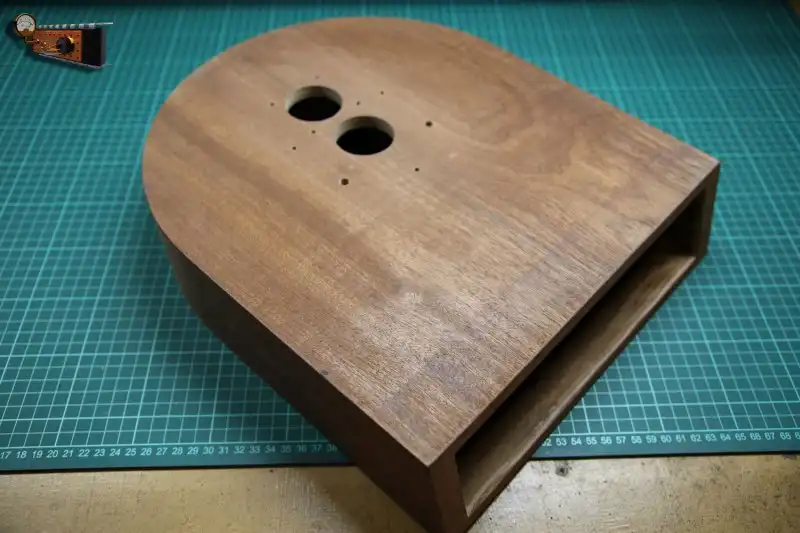 Корпус сделан из ценных пород МДФ, части его вырезаны на ЧПУ, а потом склеены и отделаны шпоном красного дерева, этот корпус мне изготовил Кирилл Соболев, за что ему моя благодарность.
