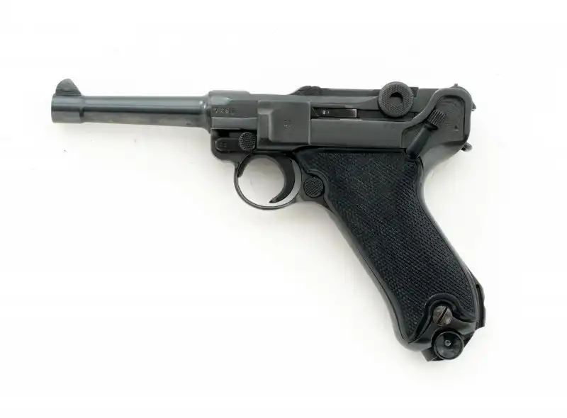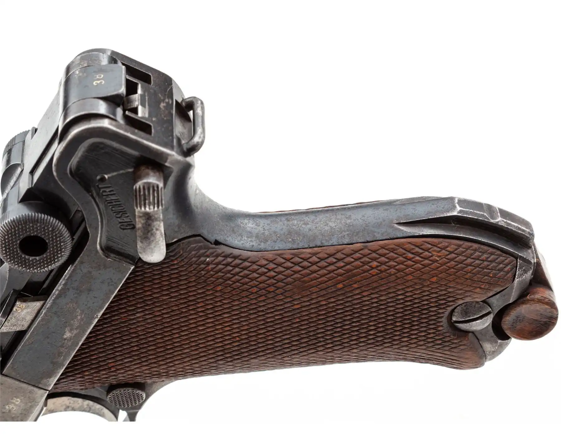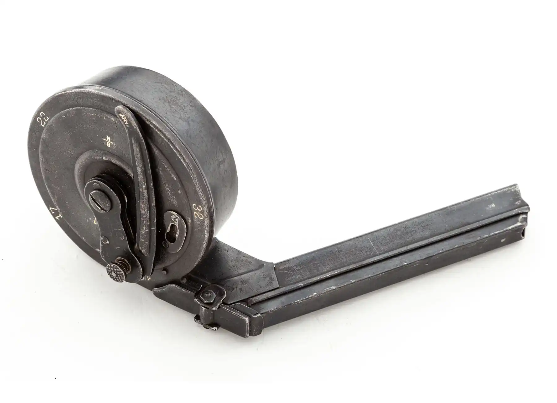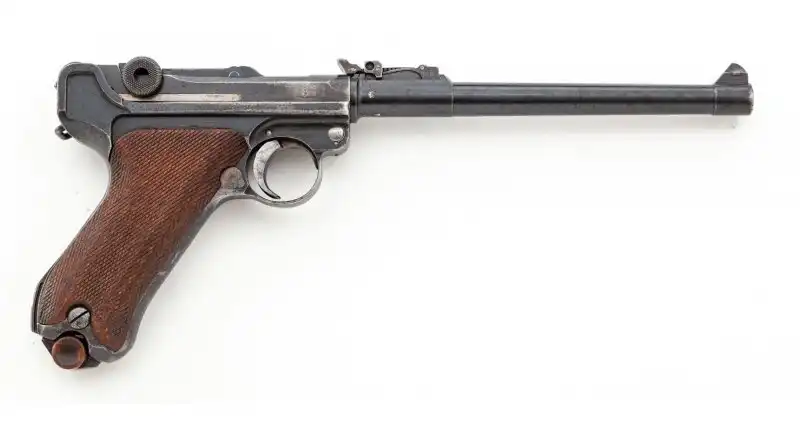 "Артиллерийская модель" пистлета системы Борхардта-Люгера образца 1914 года. 200-мм ствол калибра 9x19, приставной приклад-кобура и барабанный магазин ёмкостью 32 патрона.