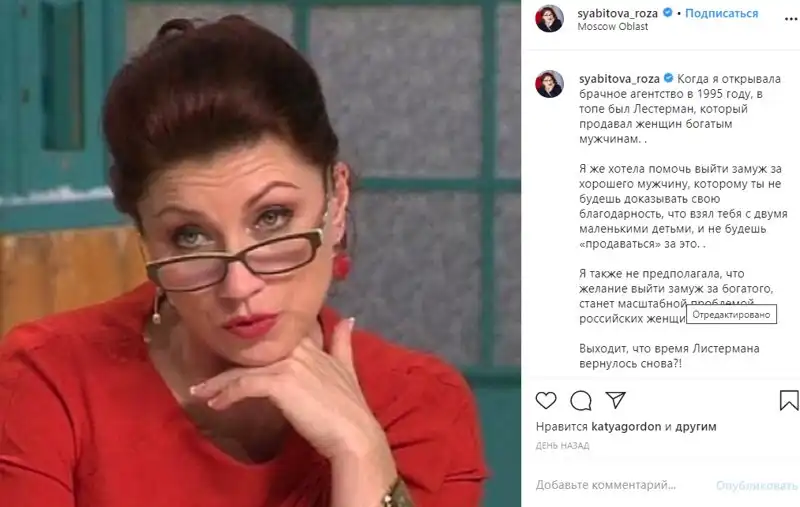 Ведущая вспомнила, что в 1995 году был популярен сводник Петр Листерман, бизнес которого строился на "подгоне" красивых женщин богатым мужчинам. Сябитова тогда, по ее словам, открыла свое брачное агентство, чтобы помочь выйти замуж тем дамам, которые не хотят продаваться. Однако современные невесты не видят в этом проблемы и готовы к вложению себя и подороже. Многие делают это с нескрываемым удовольствием, а кто-то и вовсе считает это своей миссией на земле. Выходит, что время Листермана вернулось снова?" - удивляется Сябитова на страничке своего Инстаграма. "Что с вами, женщины? Что пошло не так?" - задается вопросом сваха.