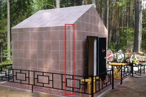 Нет, ну ладно – решили сделать что-то вроде склепа. Но почему он похож на вывернутую наизнанку ванную комнату, обшитую плиточкой? Да и вообще какой смысл в такой постройке? Раньше строили склепы как семейные усыпальницы с гробницами. А тут просто поставили будку над могилой чтобы что? Закрыть на замок и заодно хранить соленья и закатки?