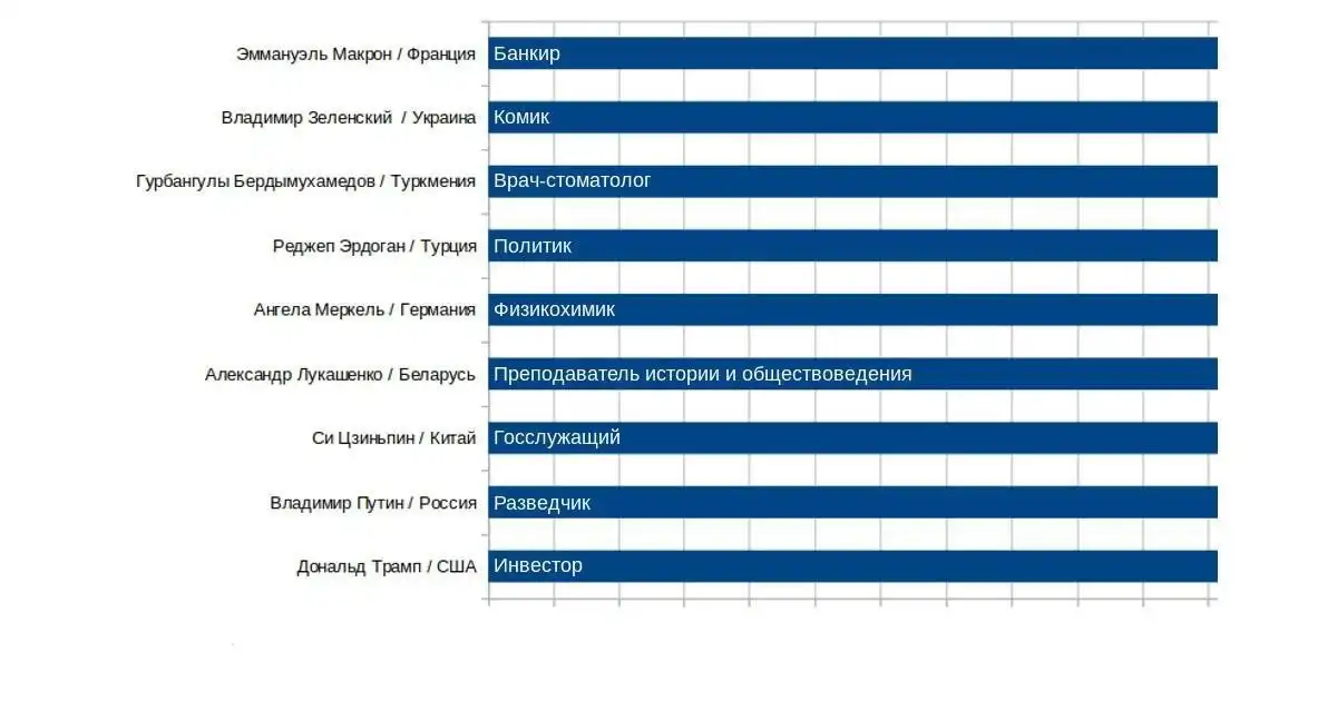 *У некоторых личностей несколько профессий. Также сложно было определить профессию у Си Цзиньпиня и Реджепа Эрдогана, которые всю жизнь занимали либо разные посты в политических организациях, либо состояли на государственной службе