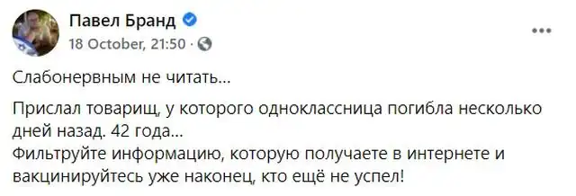 "Фильтруйте информацию, которую получаете в интернете, и вакцинируйтесь уже наконец, кто еще не успел", - написал Павел Бранд.