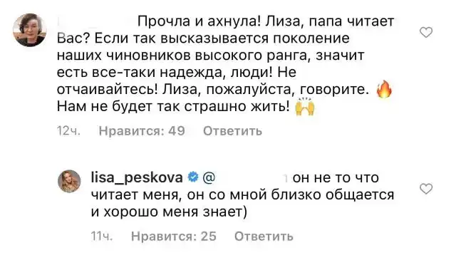Елизавета Пескова, которая является дочкой пресс-секретаря президента России Владимира Путина, решила высказаться про закон об "иноагентах". И ее мнение разительно не совпадает с отцовским. Она написала большой пост в своем Instagram, в котором выступила в поддержку СМИ-иноагентов и поддержала "журналистов в их желании бороться за свободу слова". Конечно же, в комментариях началась бурная дискуссия, поскольку многие не верят в чистоту её позиции.