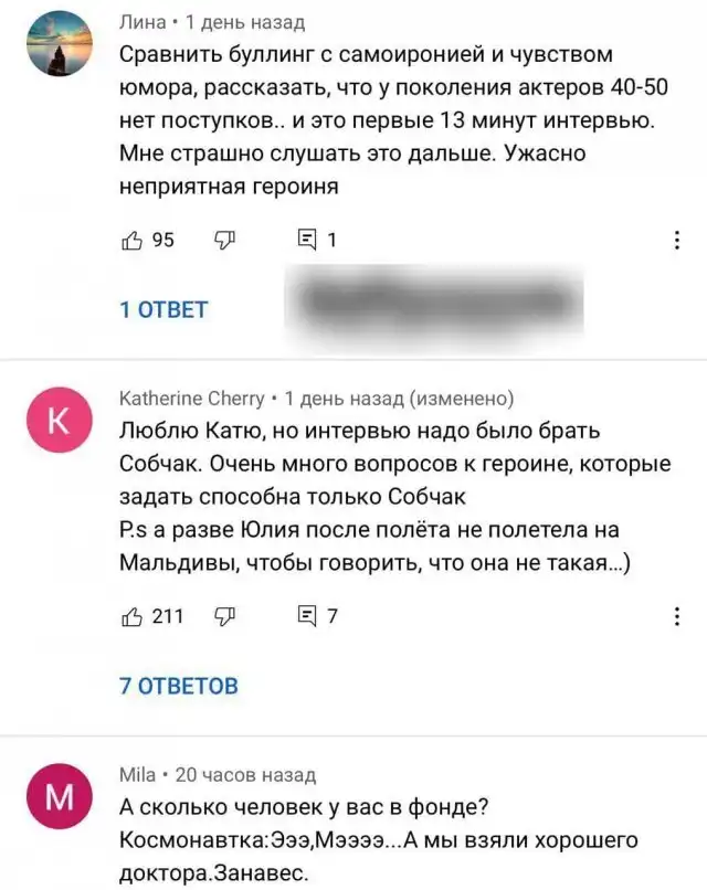Юлия Пересильд стала первой актрисой, которая снялась в космосе. Недавно она вернулась с МКС и дала интервью Екатерине Гордеевой, где, в частности, ответила на вопрос, о том, что "Роскосомс" потратил на ее полет 7 миллиардов рублей (по другим данным 2 миллиарда). Якобы эти деньги можно было бы перевести в фонд "Галчонок", который возглавляет Пересильд. Что она ответила - есть в ролике. Но вот как на это отреагировали ее поклонники и все те, кто неравнодушен к этой истории?
