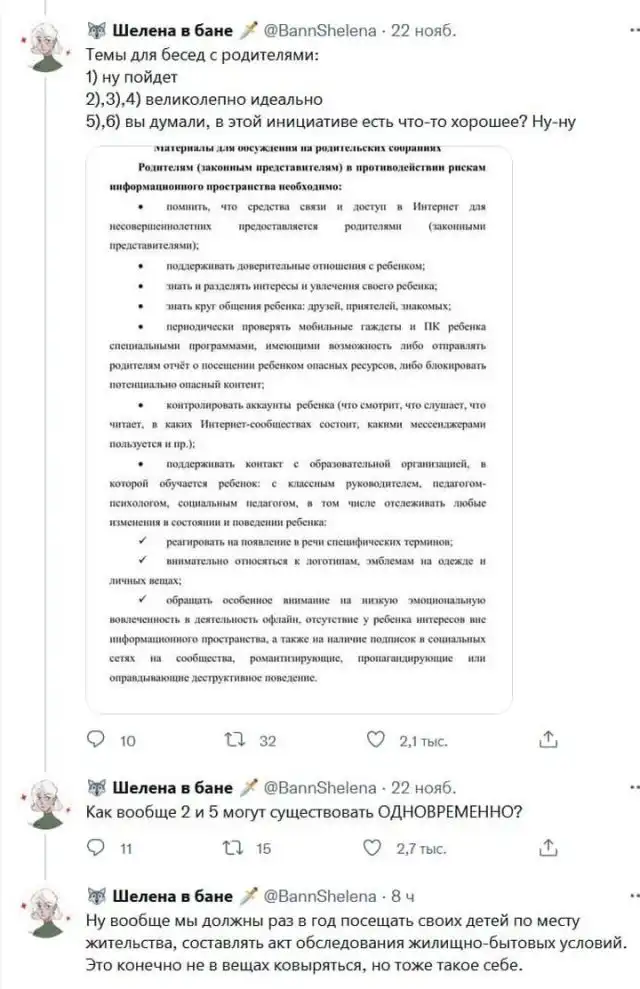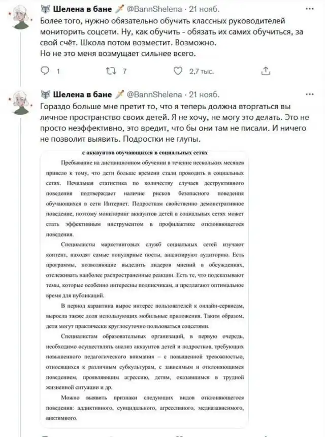 И это еще не все. В методичке сказано, что учитель должен время от времени проверять" личные мобильники и компьютеры школьников специальными программами (не спрашивайте что это), которые могут оповестить родителей о посещении учеником опасных ресурсов. Все свое негодование учительница выразила в большом посте в Твиттере.