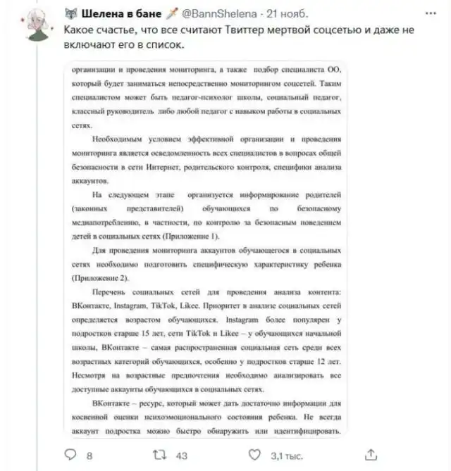 Учительница из Кургана возмутилась требованием о проверке соцсетей ее учеников на суицидальные наклонности и АУЕ. Также девушка отметила, что учителей могут лишить премий, если они не будут выполнять данное требование. По словам учительницы, проводить слежку за учениками педагогам придется в свое личное время. А чтобы им было легче, учителям выдали методичку со специальным словариком.