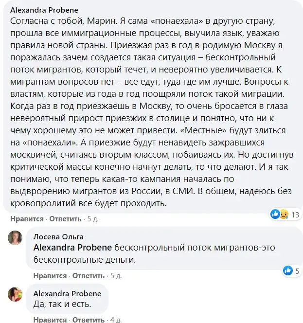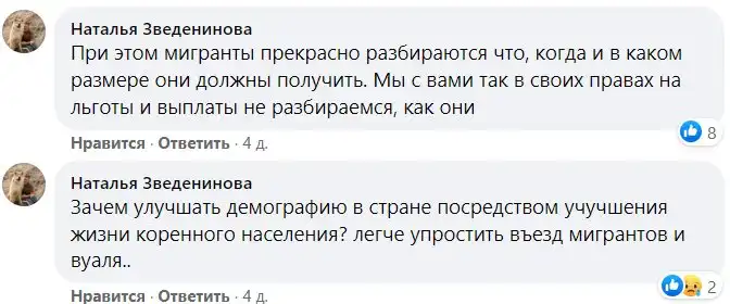 «Только за 9 месяцев предыдущего года многодетные семьи мигрантов получили — а они получают полностью все социальные пособия — они получили 170 млн рублей, это огромные деньги, ведь они переезжают большими семьями».