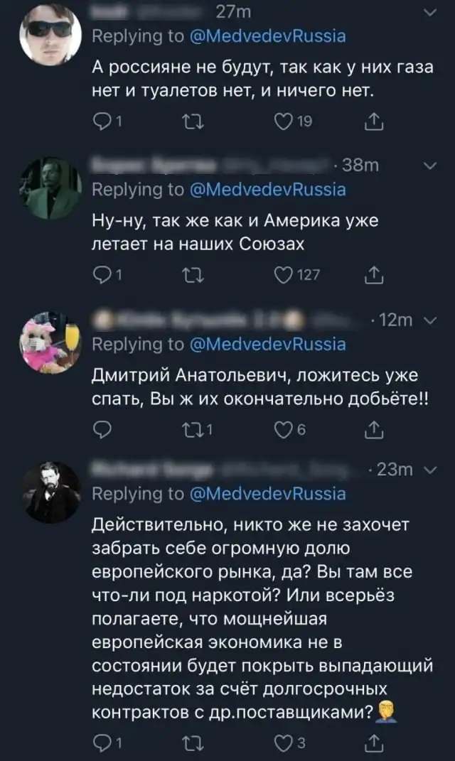 Заместитель председателя Совета безопасности России Дмитрий Медведев отреагировал на остановку "Северного потока-2". Он написал в своем Твиттере пост, в котором назвал цену на газ для европейцев - 2 тысячи евро за тысячу кубометров. Саркастичный твит подписчики восприняли довольно остро. Давайте посмотрим, что думают люди по этому поводу.