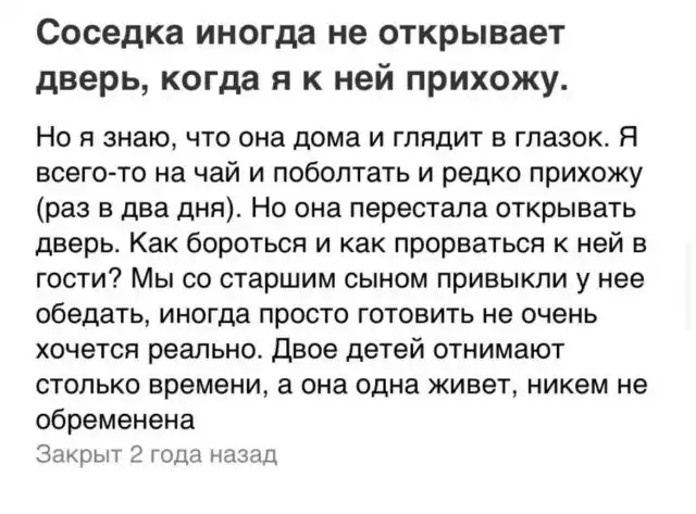 Мне тут скрин вопроса одного прислали… Дама во все колокола бьет, мол, спасите-помогите, как убедить соседку открывать мне дверь и подкармливать?