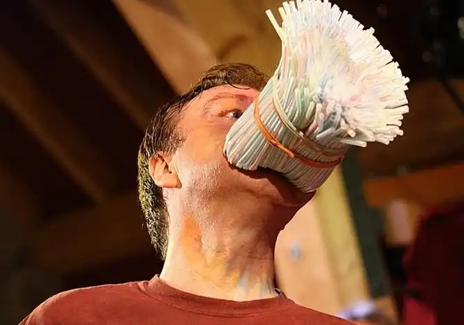 Ртом можно не только есть или издавать звуки. Ещё им можно совершать странные рекорды, как это сделал Саймон Элмор. Во время немецкого шоу "Mark ‘n’ Simon Show" он умудрился затолкать в рот четыре сотни соломинок для коктейля. Элмор не только запихал их, но и продержал соломинки во рту целых 10 секунд.