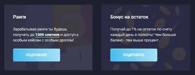 - Ранги и бонус на остаток. В процессе игры у вас будет расти ранг. С увеличением ранга на аккаунт игрока зачисляется награда 1000 слитков. С бонусом на остаток на ваш депозит регулярно будет возвращаться 1% от проигранной суммы.