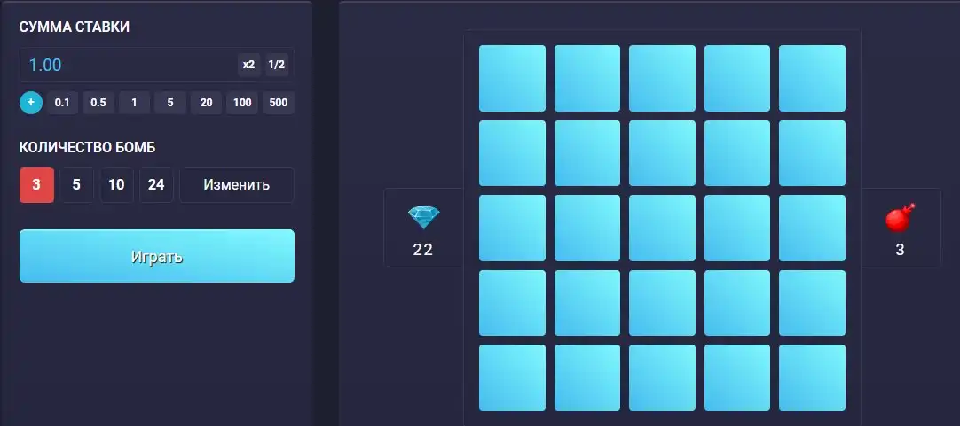Аналогично с предыдущими азартными развлечениями игра «Минер» максимально проста для восприятия каждого пользователя «Ап-Икс». В левой части сайта выберите сумму ставки и коэффициент для игры. Нажмите кнопку «Играть». Теперь на специальном поле необходимо поочередно открывать плитки, но будьте осторожны. В случае «взрыва» игра завершается и ставка аннулируется.