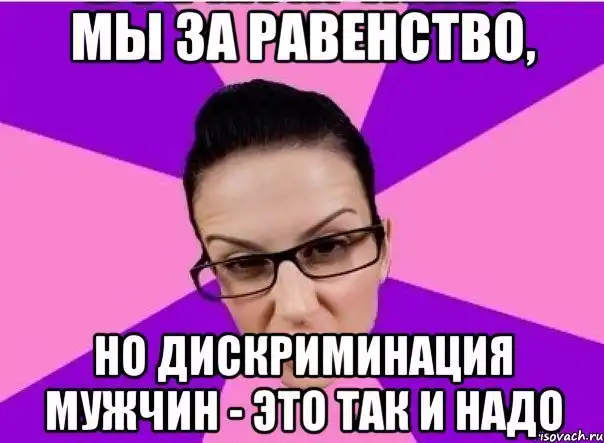 При этом о женской дискриминации говорят много — очень много. Зато о мужской дискриминации говорить вслух не принято — а она есть. И замалчивание проблемы приводит только к ее разрастанию, усугублению.