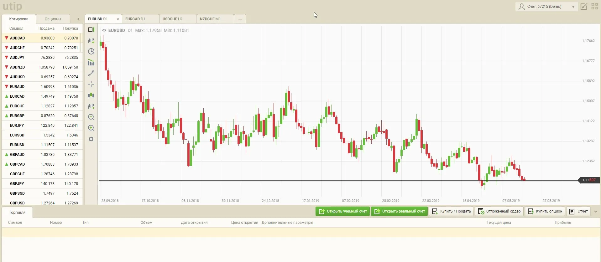 Онлайн-посредник предоставляет мощную и интуитивно понятную платформу UTIP, которая обеспечивает доступ к различным настраиваемым в соответствии с конкретными предпочтениями и потребностями отдельных трейдеров функциям. Так достаточно просто настроить расположение областей графика, размер поля ввода ордера, параметры пользовательских индикаторов и т.п.