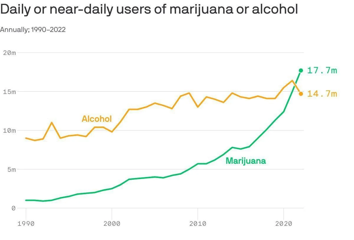 В 2022 году 17,7 миллиона американцев употребляли марихуану ежедневно или почти каждый день, а алкоголь с такой же частотой пили 14,7 миллиона человек. Для сравнения, в 1992 году, согласно опросам, марихуану ежедневно употребляли меньше миллиона американцев.