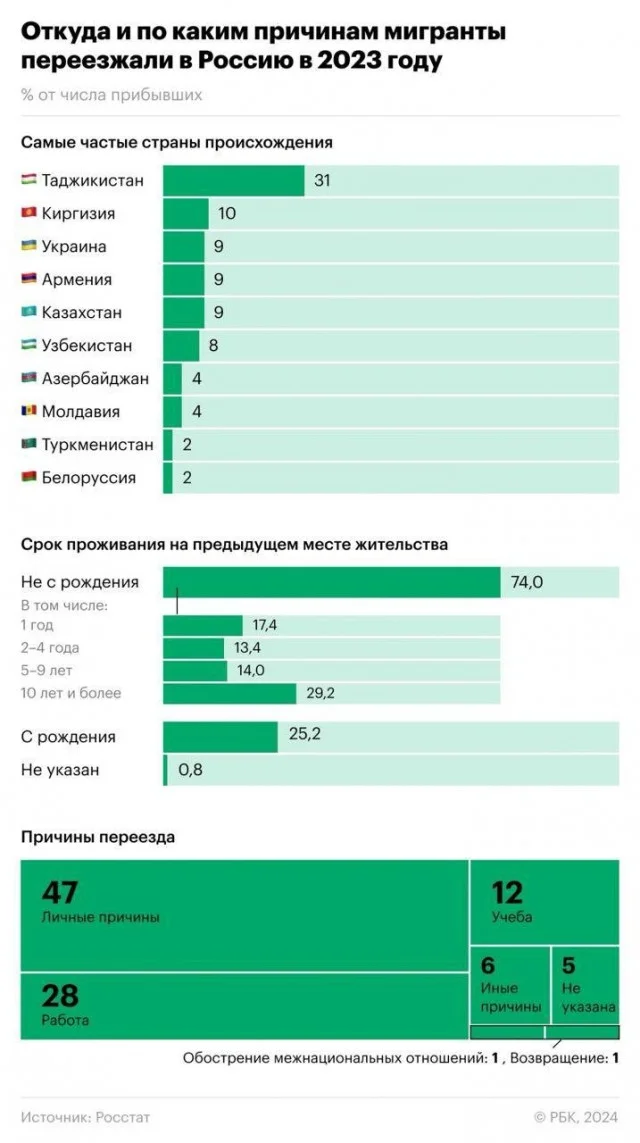 В 2023 году Россию посетило 560 тысяч мигрантов, что на 23% меньше по сравнению с предыдущим годом, согласно информации Росстата. Это число является самым низким с 2013 года, когда в страну приехали 482 тысячи мигрантов.