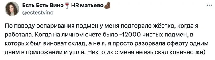 Вчера мужчина вскрывает упаковку, а ему со склада вместо шлифмашинки прислали набор отвёрток. Само собой мы оформляем возврат. Но руководство не верит сотруднику, и обязывает оплатить товар из своего кармана. Оспорить удержание за подмены довольно сложно.
