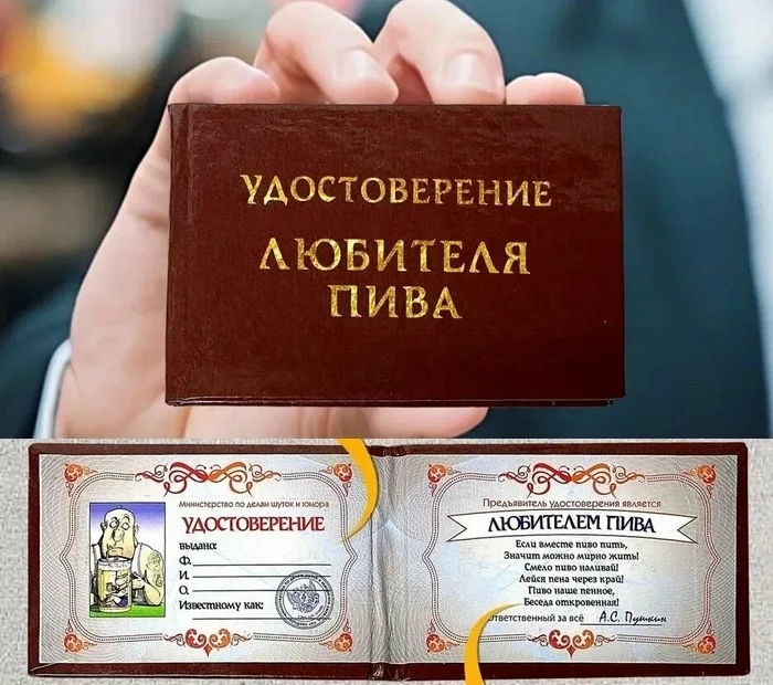 Сувенирное удостоверение шуточное Любителя Пива. Ссылка на корочку