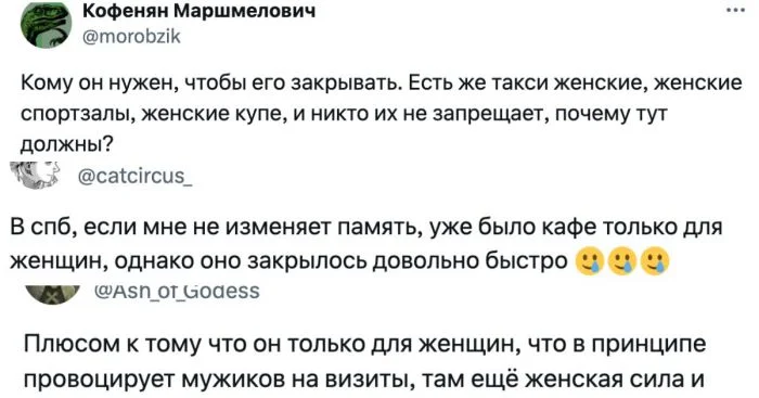 А вы как думаете, мужчины будут пытаться попасть в такое заведение, несмотря на запрет?