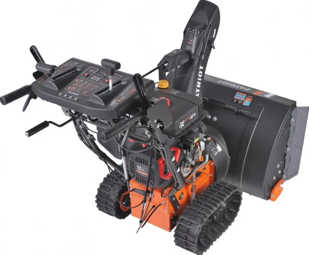 Один из самых "укомплектованных" снегоуборщиков: мощный двигатель 13 л. с, фара, электростартер, гусеницы, обеспечивающие максимальное сцепление с заснеженным грунтом и исключающие скольжение, что дает возможность убирать тяжелый снег. Легкость разворота обеспечивается блокировкой дифференциала. В конструкции снегоуборщика используются только подшипники, а не втулки. Шестерня редуктора шнека выполнена из бронзы, что в десятки раз увеличивает ресурс снегоуборщика. На заводе производится регулировка и обкатка каждой единицы техники в собранном состоянии. Ссылка на аппарат.