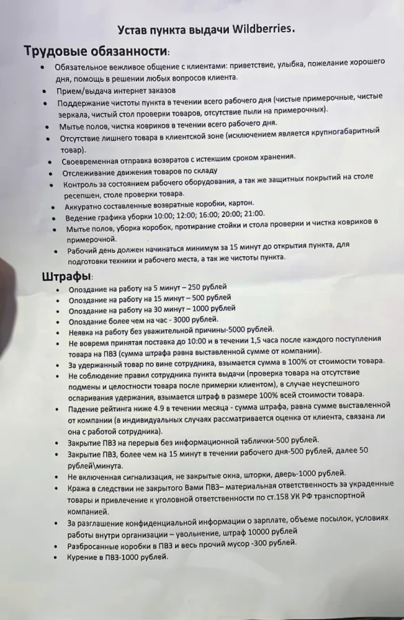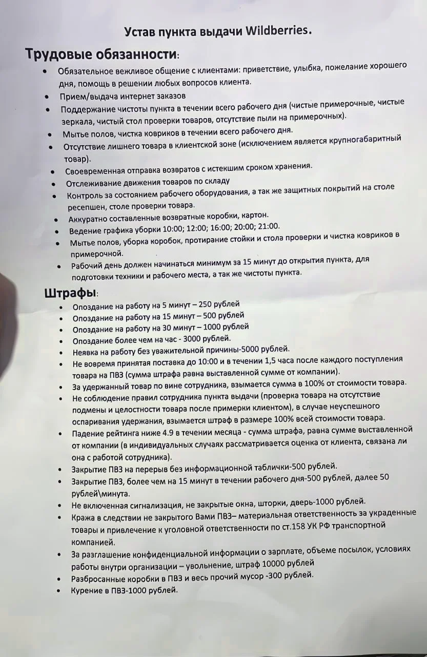 Менеджер одного из пунктов выдачи Wildberries раскрыл внутренний устав своего отделения. Правила впечатляют строгостью: опоздание всего на 5 минут обойдётся в 250 рублей, задержка на час — в 3000 рублей. Оставили открытым окно или штору? Готовьтесь заплатить ещё тысячу. А если рейтинг отделения упадёт ниже отметки 4.9, сумма штрафа будет равна всем убыткам компании.
